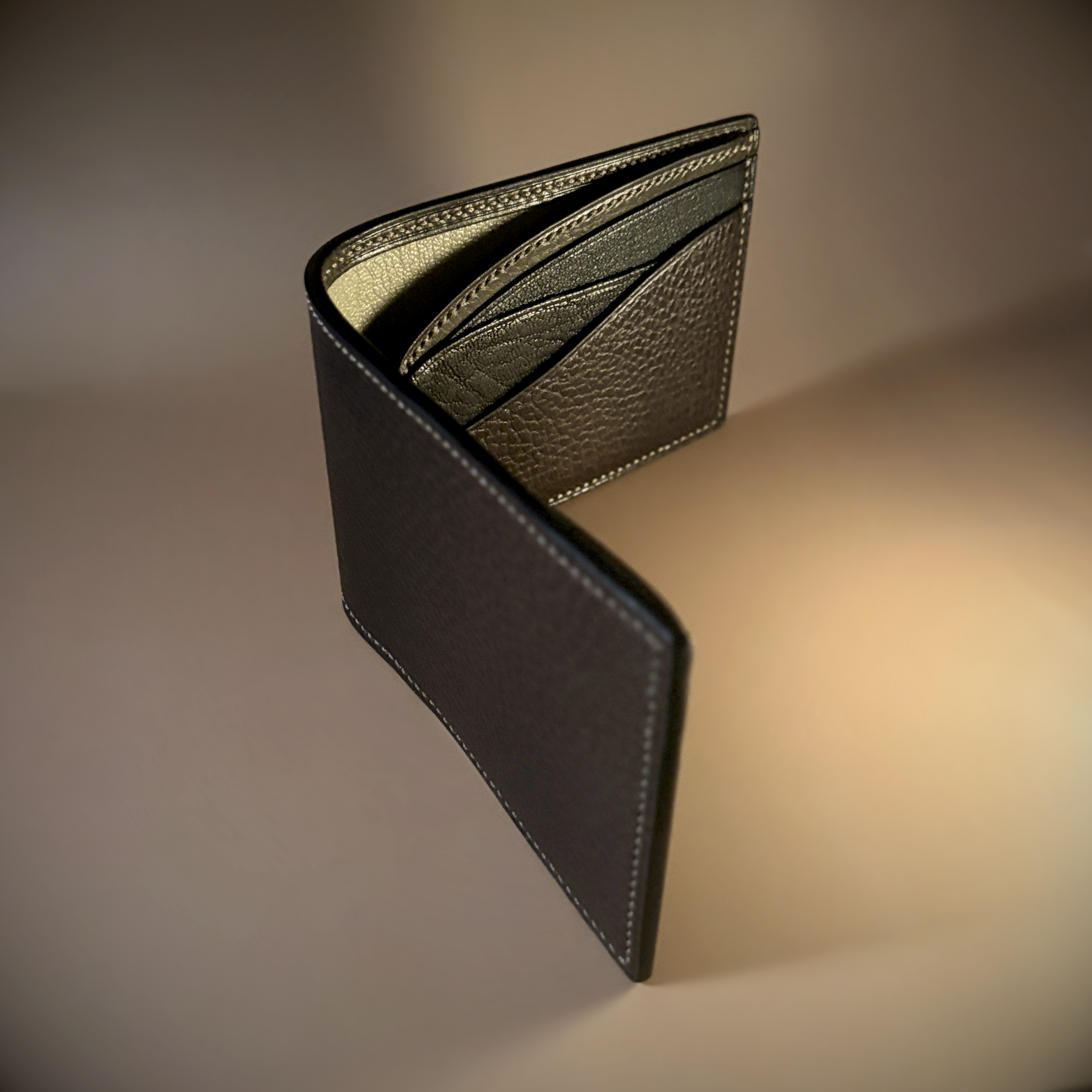Conceria Puccini Attilio – Alce antracite (hand-dyed brown in-house), Alran – “Sully” Chevre Chagrin black and taupe, Alran – Chevre “Native” rustic black, and La Bretagna – Forza olive green interior